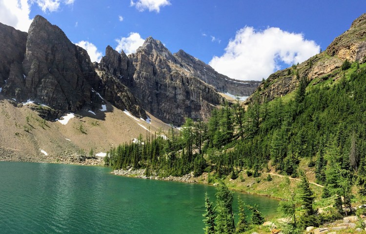 When you leave Moraine Lake, Lake Louise should be your next stop. Take your lakeside photos, then if you’re up to a long hike, follow the 6.6-mile (10.6-kilometer) round-trip Plain of Six Glaciers Trail that takes you to the far side of Lake Louise and between several glacier-topped peaks. Have lunch and a pot of tea at the remote Plain of Six Glaciers Teahouse. Alternatively, it’s a shorter hike up to the Lake Agnes Teahouse, another scenic setting for a sandwich or a snack.